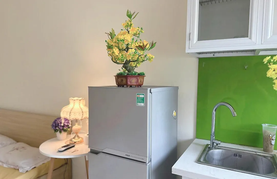 Trong số các tiện nghi khác còn có tủ lạnh và cái bếp trong nhà bếp đầy đủ tiện nghi để tự phục vụ.